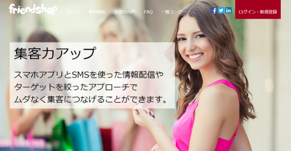 「friendshop」はSMS送信のできるスマートフォンアプリと連携した集客ツールアプリです。
