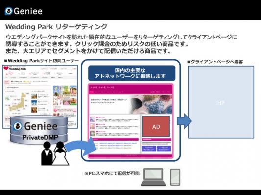 株式会社ウエディングパーク(本社:東京都渋谷区、代表取締役社長:日紫喜 誠吾 以下ウエディングパーク)が運営する式場探しの決め手が見つかるクチコミサイト「ウエディングパーク」は、最先端のアドテクノロジーを提供する株式会社ジーニー(本社:東京都港区、代表取締役社長:工藤智昭、以下「ジーニー」)と共同で、「Geniee Private DMP」を用いた結婚検討ユーザー向けのオーディエンスターゲティング商品「WeddingParkリターゲティング」(以下、本商品)を、2014年9月1日(月)より販売を開始いたします。これは業界初の試みで、今後1年後を目処に導入数100件を目指します。