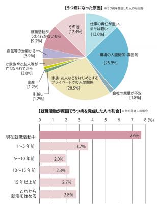 うつ病で現在就職活動中の学生の中で、就職活動がうつ病の原因と回答した人が7.6%と一番高い結果に。