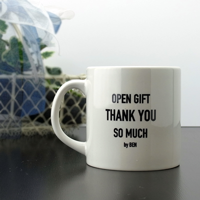 2014年3月にオープンした岐阜のヘアサロンが、新規開店記念として制作されたマグカップ。シンプルにデザインされた名入れは、同店オーナーによるお客様や関係者に向けた感謝のメッセージ。支えてくださった皆様に、謝意とともにお配りになったそうです。