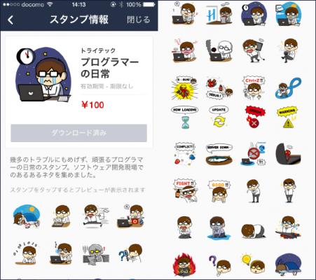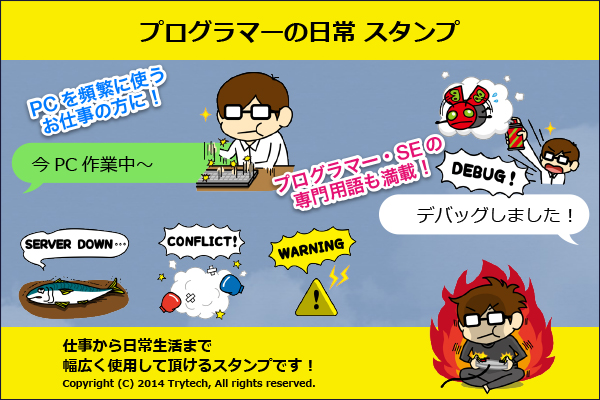 株式会社トライテック(本社:静岡県静岡市、代表:太田則明) は、LINEクリエイターズスタンプ「プログラマーの日常」を、LINE株式会社(本社:東京都渋谷区、代表取締役社長:森川亮)が運営する無料通話・無料メールアプリ「LINE」内のスタンプショップにて、7月31日に販売を開始しましたことを発表致します。