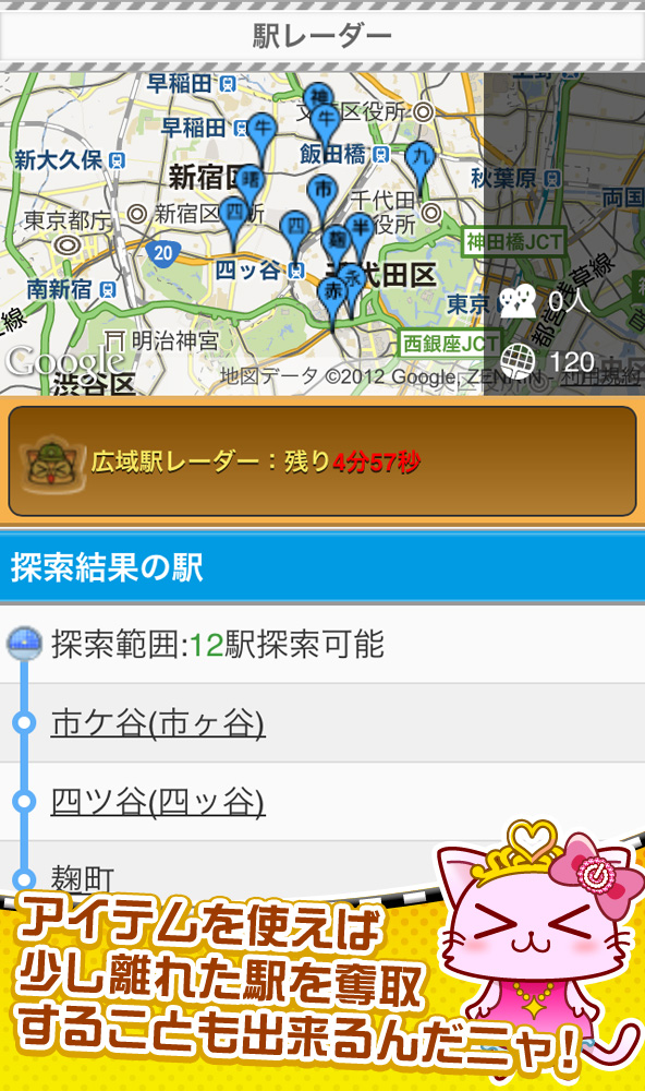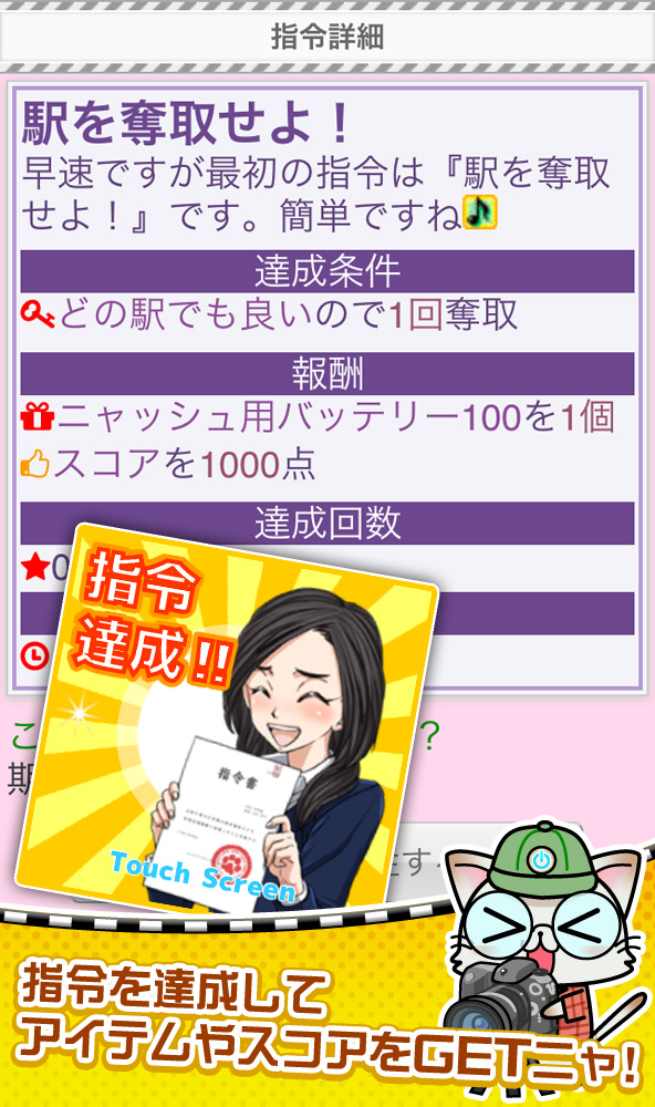 位置登録機能を使ってユーザーのいる鉄道駅を「奪取」し全ユーザーで日本全国の駅を奪い合う位置ゲームです。リアルタイム&リアルスポットで陣取りができ、一万近い駅をコレクションしたり、称号を集めたり、ランキングを競ったりなど、遊び方は自由です。毎日のログインであなたの電車移動のライフログとしてもお楽しみいただけます。
