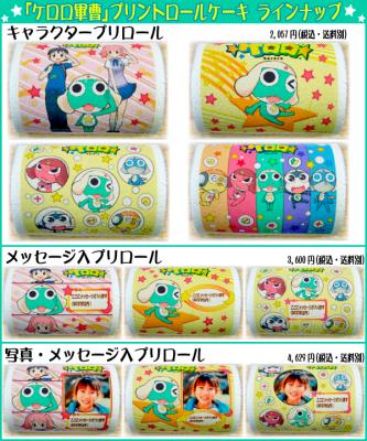 「ケロロ軍曹」たちがプリントされたロールケーキです。デザインは4種類よりお選び頂けます。デザインが完成しているのですぐに注文が可能です。