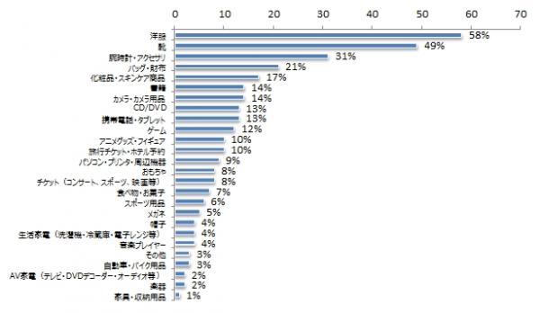 ・「洋服」「靴」「時計・アクセサリー」などファッションアイテムが購入商品の上位を占める