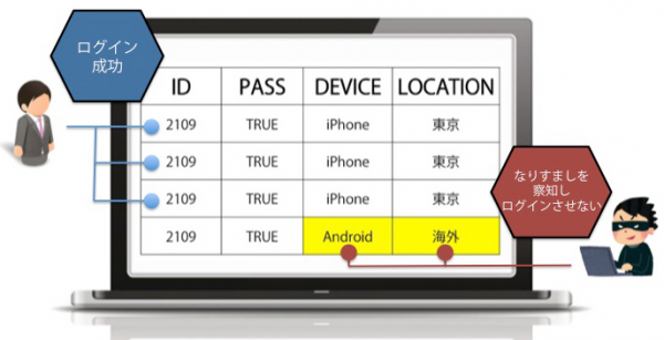 Webサービスを利用するユーザーのログイン履歴をデータとして蓄積し、「その人らしさ」をベースにログイン行動がそのユーザーによってなされたものであるかを識別。不正な第三者が、なりすましてログインするのを未然に検知し、不正ログインを防ぐことができます。