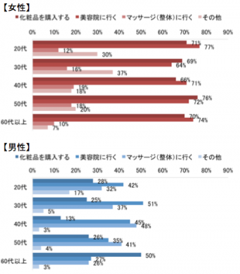 「マッサージ(整体)に行く」と回答した女性は1割強、男性の場合は3~4割を超えており男性の割合が高いということになりました。