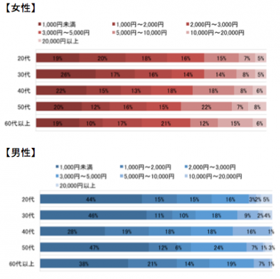 男性ですが、1,000円未満と回答している人がどの年代でも一番高いようです。