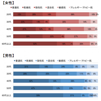 一方、男性の場合は「普通肌」「脂性肌」と回答した人の割合が高いようです。