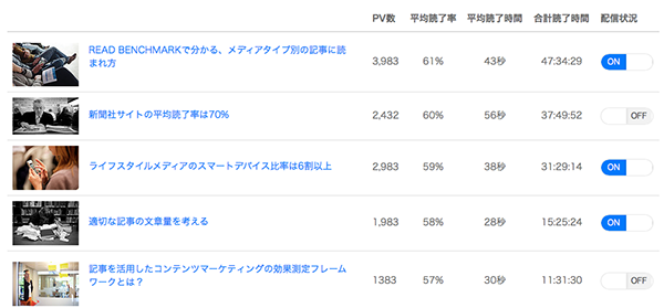 記事コンテンツを持つオウンドメディアにREADを導入することで、全ての記事コンテンツの読了状況(読了率、読了時間など)を解析し、マーケティング効果の高い「読まれるコンテンツ」を見つけ出す事が可能です。解析結果に基づきpopIn Discoveryに配信するコンテンツを選択することで、誘導する読者との高いエンゲージメントの構築が期待できます。また、配信用のクリエイティブ(画像、タイトル、URLなど)は自動取得されるため、素材入稿にかかる負荷を削減可能です。