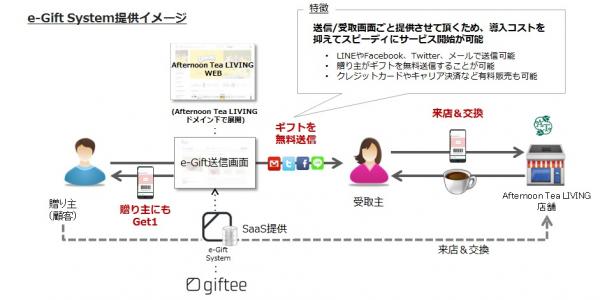 株式会社ギフティ(本社:東京都品川区、代表取締役: 太田睦)は、2014年8月28日(木)より、株式会社アイシーエル(本社:渋谷区、代表取締役社長:勝浦清貴)が運営するAfternoon Tea LIVINGに、当社開発のギフト販売システム「e-Gift System」の提供を開始いたしました。無料キャンペーンでの利用を目的としたe-Gift Systemの提供は、今回が初めての事例となります。