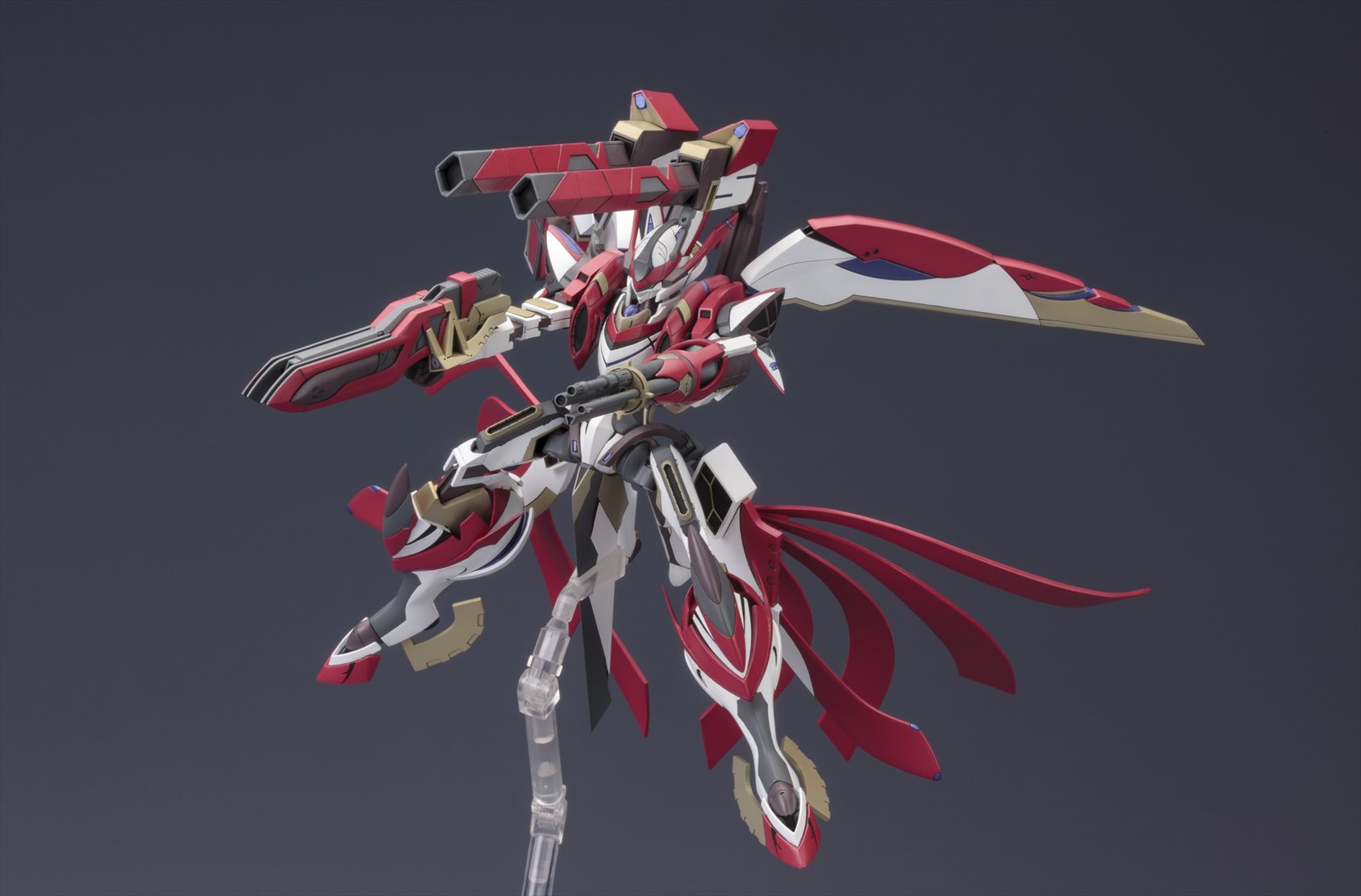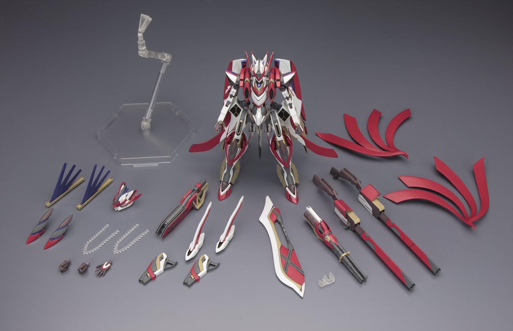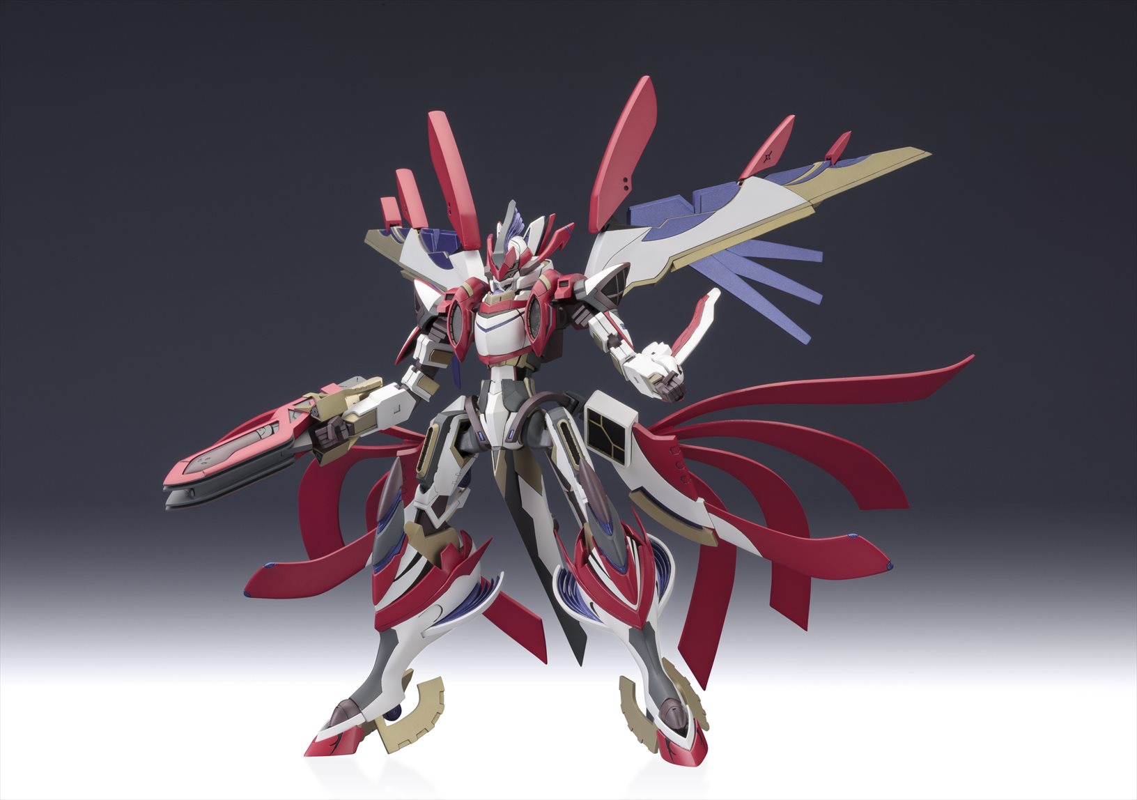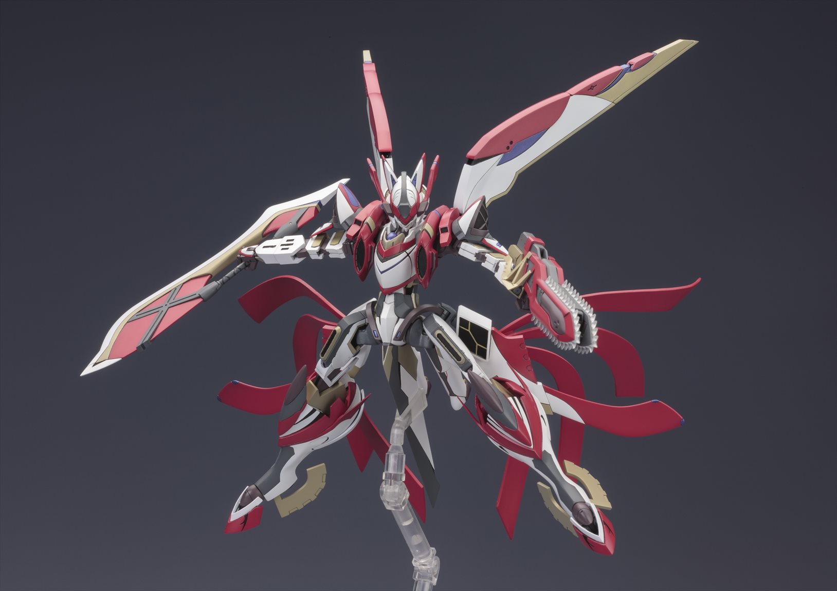 特徴的な機体フォルムやアクションギミックの再現はもちろんの事、多彩なオプションパーツが付属する豪華仕様でのリリースとなります。特徴的なカラーリングを、7色成型と水転写デカール(予定)で可能な限り再現。各部の関節が可動し、劇中で見せた様々なアクションに対応。頭部、背部ウイングなど各部位の差し替えにより「フルバースト形態」を再現可能。「HEPキャノン」「マルチランチャー」「大剣」「大型ビーム砲」「ビームキャノン」「アームソードカウンター」等、劇中で登場した武装が多数付属。劇中で印象的だった浮遊ポーズでのディスプレイが可能なスタンドベースが付属。