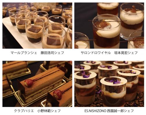 テイスティング会には、マールブランシェの藤田浩司シェフ、サロンドロワイヤルの垣本晃宏シェフ、クラブハリエの小野林範シェフをはじめ、7名の関西を代表するパティシエが参加し、「コーヒー」をテーマに創作したスイーツを披露しました。
