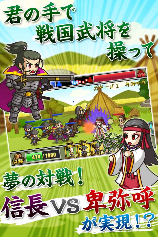 大殿のほか、真田幸村や黒田官兵衛などの「武将」、足軽・鉄砲・騎馬などの「兵」の3兵種を使い分けながら、合戦で勝利し手に入れた「銅銭」を使って武将や兵のステータスを上げ、全100ステージのクリアを目指しましょう。
