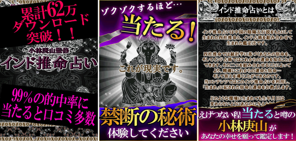 「恐ろしいほど当たる!」と話題になり、占いアプリでは成し得なかった超異例の実績を成し遂げた神秘の究極的中「インド推命占い」があなたの運命の全てをズバリ見抜きます! 自分の運命を知る覚悟ができているのなら……この未だかつてない衝撃の的中鑑定をご体感ください。