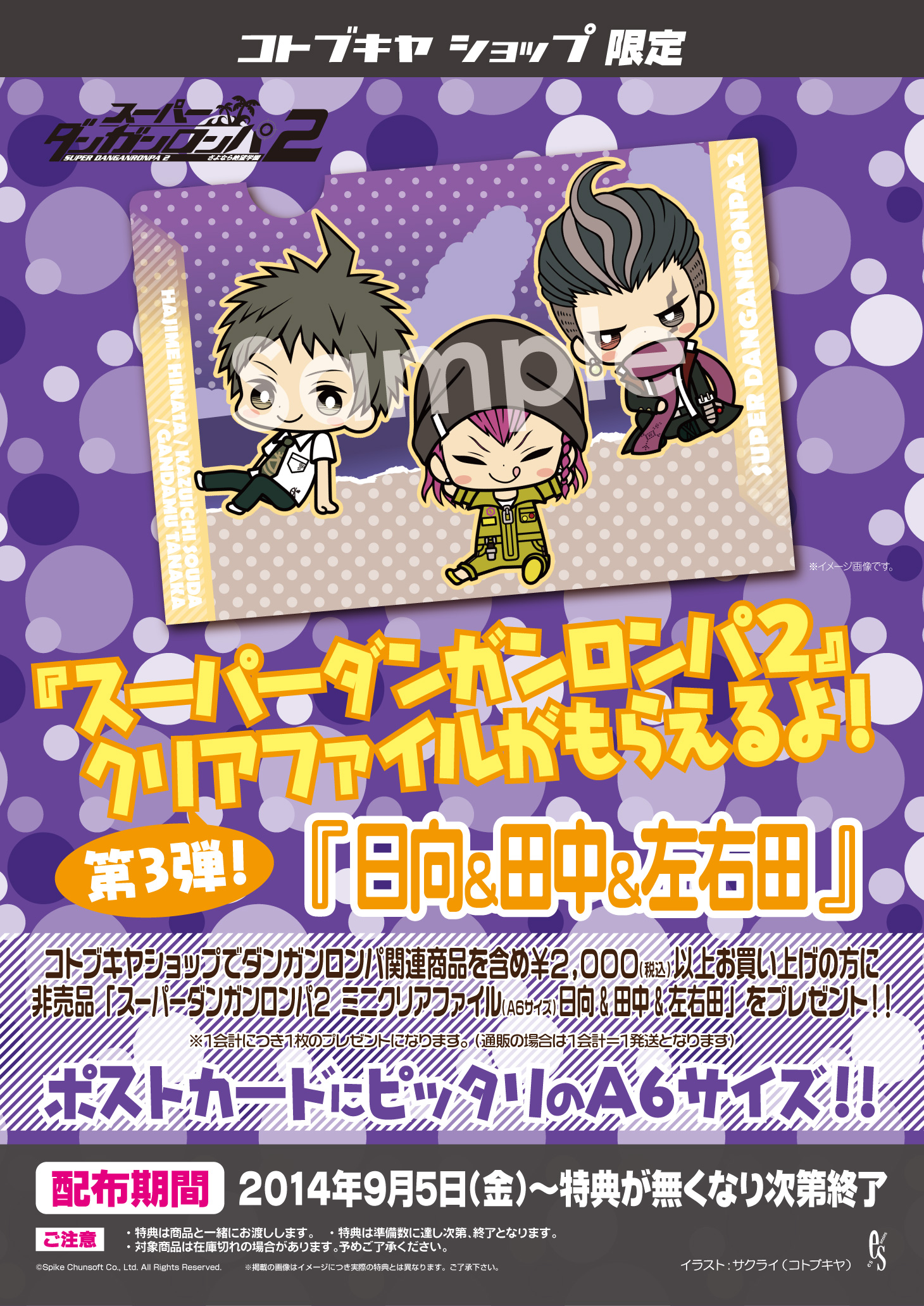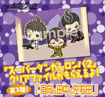 株式会社壽屋(本社:東京都立川市曙町/ 代表:清水一行)は、メーカー直営店であるコトブキヤショップ各店(秋葉原館、日本橋、コトブキヤオンラインショップ)でダンガンロンパ関連商品を含め2,000円以上お買い上げ頂いた方対象に、「スーパーダンガンロンパ2 ミニクリアファイル日向&田中&左右田(A6サイズ)」をプレゼントします。雑誌「ビーズログ」7月号に掲載されたイラストレーターサクライ氏描きおろしのデフォルメイラストを使用したクリアファイルになります。2014年9月5日(金)より各ショップで配布スタート予定、無くなり次第終了となります。