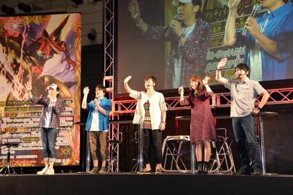 また、文化放送で放送中のラジオ番組「バトスピ大好き声優の生放送」が今年も「バトスピ大好き声優の生ステージ」として開催。“バトスピ大好き”声優の諏訪部順一、阪口大助、中村悠一、福山潤、井口裕香が出演する超豪華な演出の中、声優陣同士によるイラスト対決や「バトルスピリッツ」の生バトルなどが繰り広げられ、大盛況なステージとなりました。