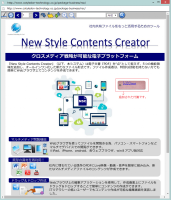 『New Style Contents Creator』はマルチメディア情報及び機能をオールインワンコンテンツとして一つのファイルに生成する、電子パンフレットプラットフォームです。