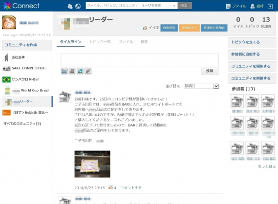 はせがわ酒店ではワールドカップを盛り上げると同時に日本酒の良さを世界の人に知ってもらうために2014 FIFA World Cup BrazilTM オフィシャルライセンス商品の「日本の酒シリーズ」を企画、販売することが決定し、各店舗で「日本の酒シリーズ」の販売を盛り上げてもらうために「リーダー」を立てました。このように数ヶ月をかけて実施するようなプロジェクトやイベントの中で、有益な情報を共有し、蓄積するためにConncet(コネクト)を活用しています。