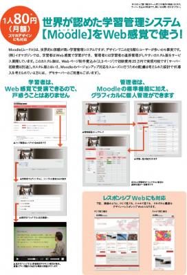 Moodle【ムードル】は、世界的に信頼が高い学習管理システムですが、デザインで二の足を踏むユーザーが多いのも事実です。(株)イオマガジンでは、学習者はWeb感覚で学習ができ、管理者には学習者の進捗管理がしやすいカスタム版をサービス展開しています。このカスタム版は、Webページ制作費込み(2、3ページ)で初期費用25万円で実現可能です(サーバー初期費は別途)。カスタム版とはいえ、Moodleのバージョンアップ対応をスムーズに行うための配慮は考えられた設計で、レスポンシブWebにも対応。導入を考えられている方にはデモサーバーのご用意もございます。また、シングルサインオンについてもオプションで対応可能です。