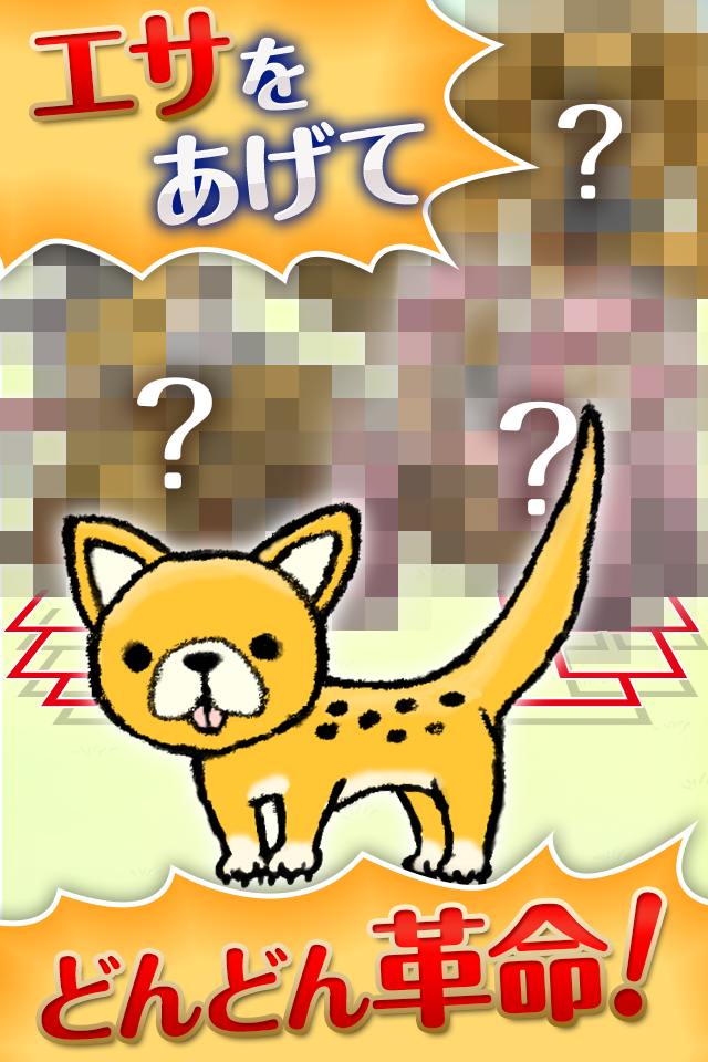 わんこにエサをあげると「まんぷく度」と「れぼりゅーしょん」のゲージが貯まり、「れぼりゅーしょん」がMAXになるとわんこが進化(成長)します。