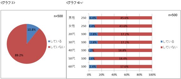 男女別でみると、女性より男性の実践率がやや高く、年代別では20代30代の実践率が40代以上よりもやや高い傾向がうかがえる。