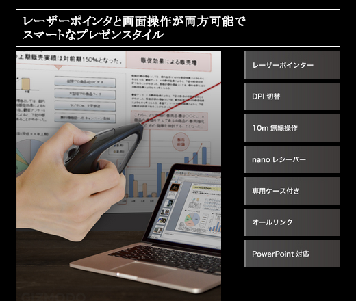 更にプレゼン等で使用する機会の多い方からの要望に答え、赤色レーザーポインタを搭載(PSE取得済み)し、使用シーンの幅が広がりました。