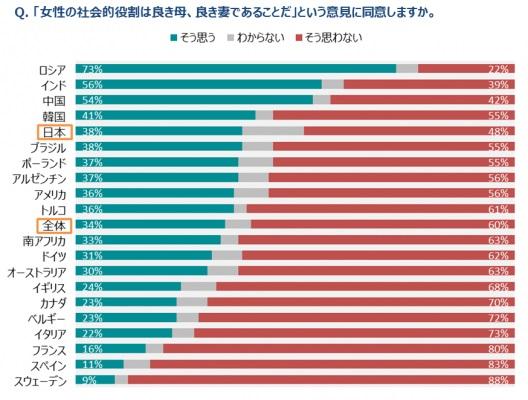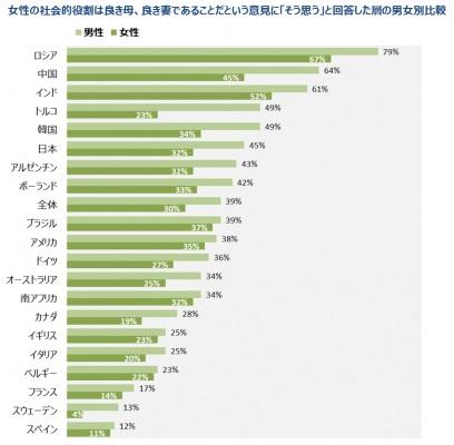 このような傾向は女性の社会的役割に良く母、良き妻を求める割合の低かったスウェーデン(女性4%、男性13%)、カナダ(女性19%、男性28%)などでも見られた。