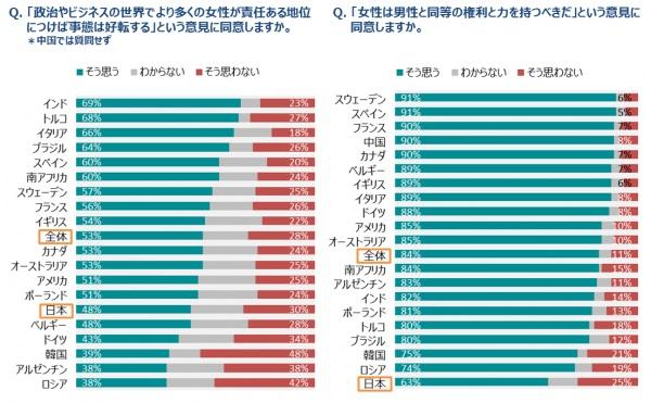 「女性は男性の同等の権利と力を持つべきだ」という意見には、全体の84%が「そう思う」と回答した。日本では「そう思う」と回答したのは63%に止まり、調査対象20カ国中最低であった。