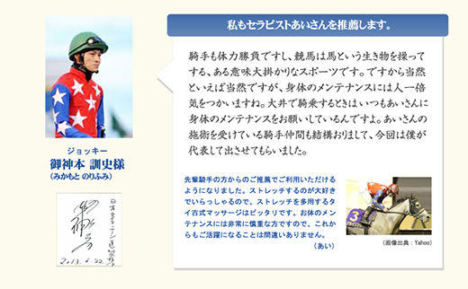 (上画像:御神本氏の推薦の言葉、下画像:大井競馬場でのセラピストあい)