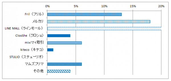 続いて、フリル(Fril)、メルカリとフリマアプリを代表する名前が挙がりました。特に、フリルやメルカリは女性の利用者が多く、当社の利用者層とも重なるところが多い状況です。