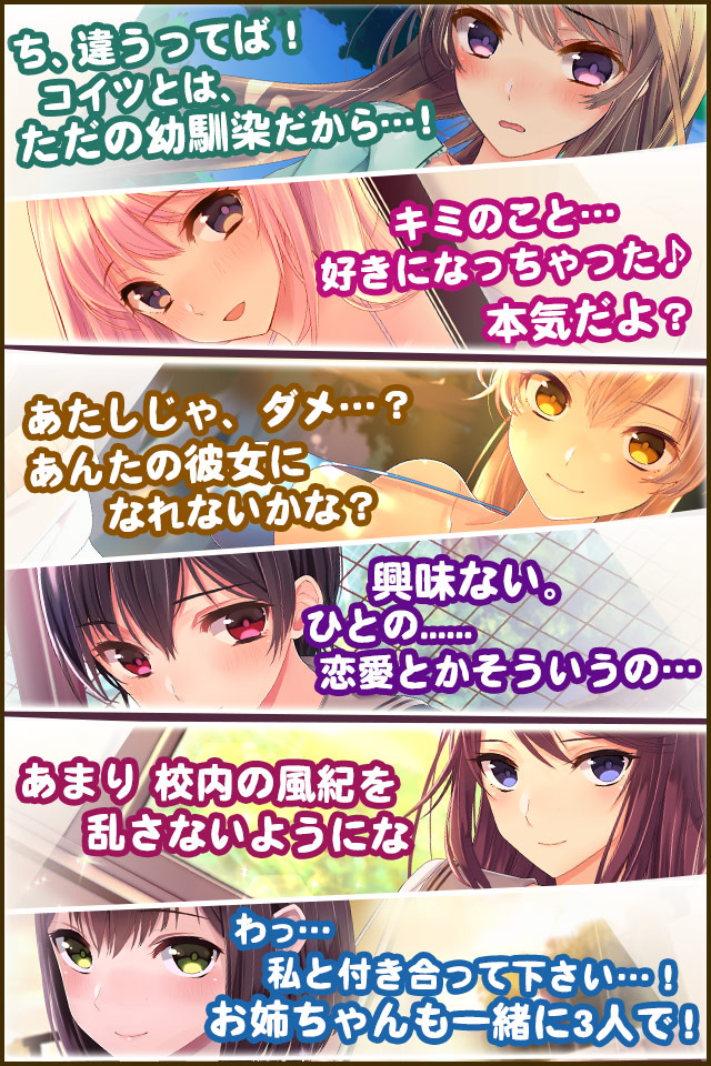 人生最大のモテ期到来!なんと、2人の彼女とつきあうことに!?魅力的な6人の美女に、いっぺんに言い寄られて…もうたまらない!?夢のようなシチュエーションで、ドキドキの学園生活を楽しむことができます。