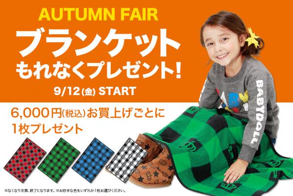 株式会社コージィコーポレーションが運営するベビー・キッズ服ブランドBABYDOLL(ベビードール)がBABYDOLL・STARVATIONS各店にて、[オータムフェア]6,000円(税込)お買い上げごとにブランケットプレゼント!を9/12(金)よりスタート!