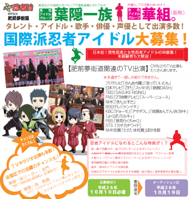 日本各地にある名産とローカルな観光地を萌えキャラとマンガでPRする事業『姫乃美琴PROJECT』を手掛ける株式会社神羅カンパニー(所在地:佐賀県佐賀市、代表取締役 松尾佳鷹)は株式会社マールとの共催で、佐賀県嬉野町にある九州唯一の忍者テーマパーク肥前夢街道(http://www.hizenyumekaidou.info/)「ご当地忍者アイドル葉隠一族第参期生オーディション」に続き、2014年9月10日に「くのいちアイドル」候補となる女性の募集も開始しました。