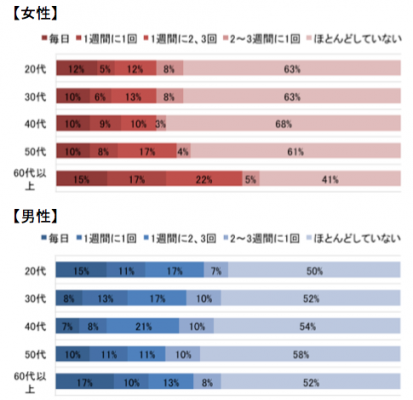 そして「毎日している」方は女性の場合、30代~50代は平均10%、一番高い割合は20代・60代の平均16%でした。