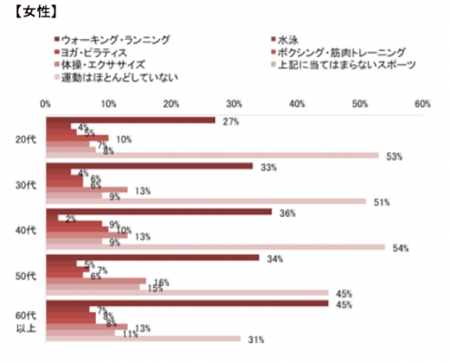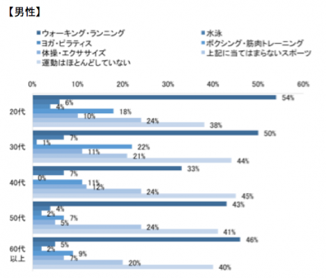 男女共に「ウォーキング・ランニング」をしている方の割合が高いようです。特に女性の60代は5割近く、男性の場合は20代~30代の方は5割を超えていました。