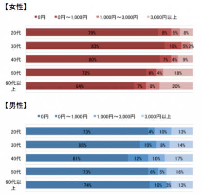 「0円~1,000円」「1,000円~3,000円」と回答している方も男女共にあまり差はなく、約1割でした。