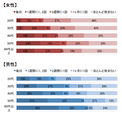 女性の場合は「ほとんど飲まない」方は20代・30代は4割ですが、年代が上がるにつれ割合が減っていき、40代~60代以上の方は3割でした。