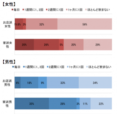 それに比べ、家派の女性は飲酒頻度が多い方が多く、「毎日」という方は20%、「1週間に1、2回」という方も26%となり、お店派の方と比べると約20%も差がありました。