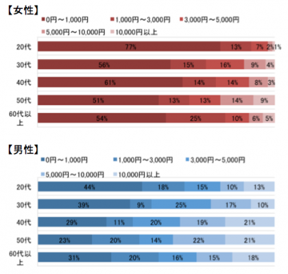 女性の場合は、「0円~1,000円」という方がどの年代も多く5~7割でした。
