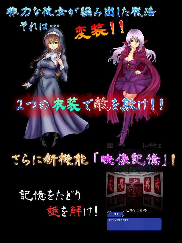前作で好評だった「人間と吸血鬼の切り替えシステム」が「衣装切り替えシステム」として生まれ変わり、アリスが使用します。アリスは教会にいる人や敵となる死霊の目をごまかすために2種類の衣装を使い分けます。