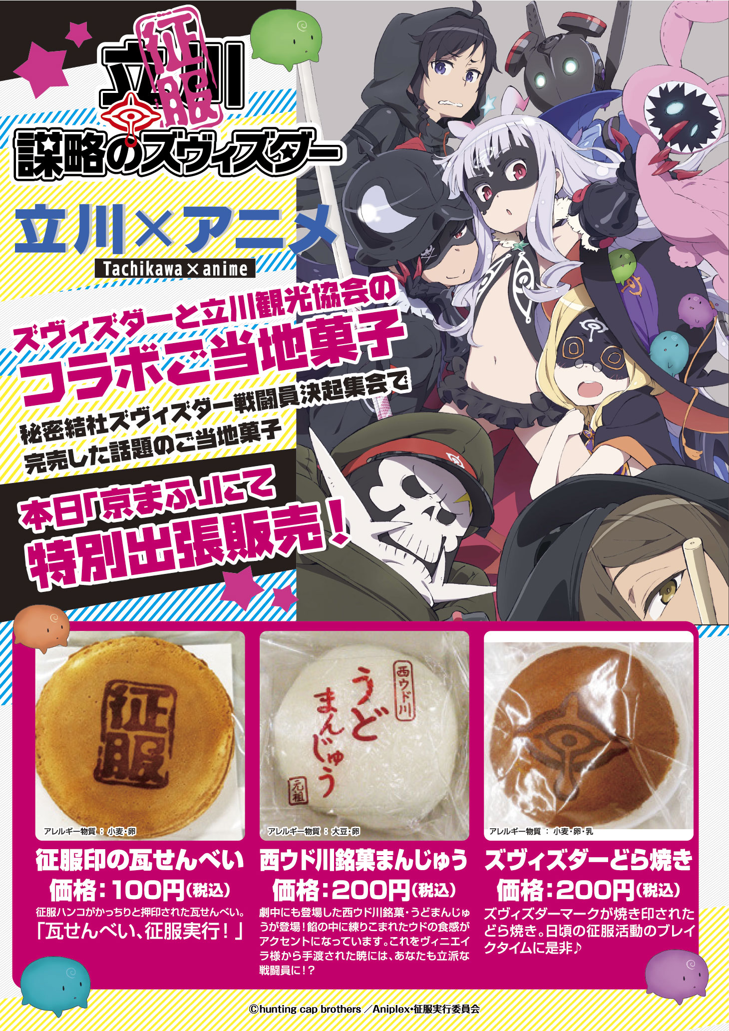 コラボレーションの一環として、アニメの聖地として有名な立川の観光協会コラボご当地菓子『謀略のズヴィズダー』の「征服印の瓦せんべい「西ウド川銘菓まんじゅう」「ズヴィズダーどら焼き」を、立川のアニメ聖地化を応援しているコトブキヤが出張販売します。(こちらは、ズヴィズダー戦闘員決起集会イベント販売で即完売した御当地菓子と同じものになります。)また、「コトブキヤショップ」の出張出店を行い、コトブキヤメーカー商品の販売も予定しています。