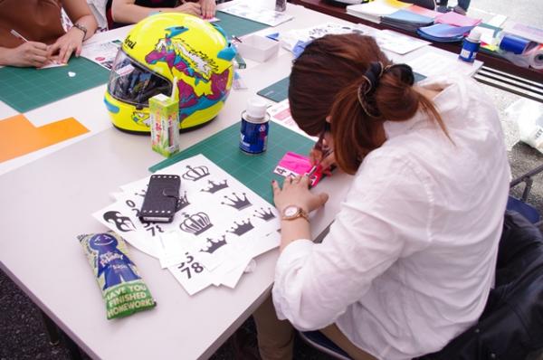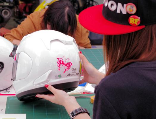 その結果を踏まえ、蛍光イエローを中心とした夜間に視認性の高いカラーのカッティングシート(R)を用意し、女性ライダーに好きなように切り抜いて使ってもらった他、蝶やアルファベットなどをモチーフとした「型紙」に合わせて切り抜いたシートでご自身のヘルメットをデコレーションしていただきました。
