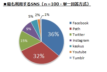・最も利用しているSNSは「Facebook」(36%)、2位は「Path」(32%)、3位「Twitter」(15%)