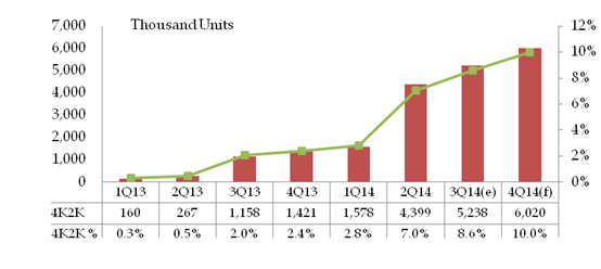 2013年の4K2Kパネルの出荷数はLCD TVパネル出荷総数のうちの1.3%を占めていたが、2014年には大幅に成長し、出荷総数の7.2%を占めることが見込まれる。「2013年の基準期間が比較的短期であった影響もあり、2014年にはより多くのパネルメーカが4K2Kパネル市場へ参入し、より多くの4K2Kパネルのスクリーンサイズが導入されていく。」とChen氏は語る。2014年ではこれまでのところ、これらの要因が4K2Kパネルの出荷量全体の伸びを後押ししている。