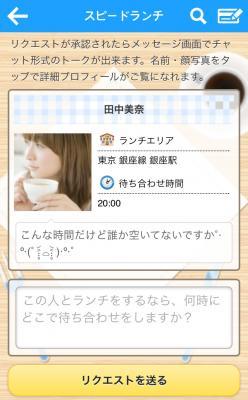 『スピードランチ』で友人と待ち合わせをする際に作成するランチカードの待ち合わせ時間を、現行の11時~15時から、11時~22時まで設定可能に変更しました。これにより、通常のランチの時間帯だけではなく夜の時間帯でのマッチングも可能になりました。