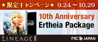 PC向けオンラインゲーム『リネージュ2~Epic Tale of Aden~(以下、『リネージュ2』)』をサービス、運営しているエヌ・シー・ジャパン株式会社(東京都渋谷区、代表取締役:金 澤憲(キム テクホン))は、2014年9月24日(水)午前10時から2014年10月29日(水)定期メンテナンス前まで、「10thAnniversary Ertheia Package購入者限定 スペシャルミッションキャンペーン」を実施いたします。