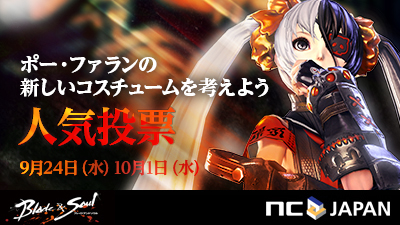 PC向けオンラインゲーム『ブレイドアンドソウル』をサービス、運営しているエヌ・シー・ジャパン株式会社(本社:東京都渋谷区、代表取締役:金 澤憲(キム テクホン))は、2014年9月24日(水)から2014年10月1日(水)の間に東京コミュニケーションアート専門学校(以下TCA)と協同で実施した企業プロジェクト「ポー・ファランの新しいコスチュームを考えよう」にて、学生が制作したイラスト作品を対象に、人気投票を実施いたします。