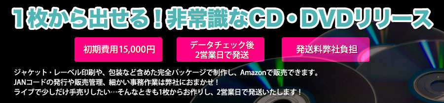 「オンデマンドAmazon販売」は受注生産方式をとっており、1枚からCD作成可能なシステムとなっております。生産されたCDはAmazonで販売されます。また販売時に必要なJANコードも弊社で取得致します。このサービスを使えば簡単にCDリリースが可能な今までにない斬新なサービスとなっております。