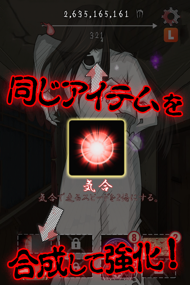「気合」「塩」などのアイテムを集め、館の中を漂う火の玉をタップしたり、アイテムを使うことで、迫ってくる少女との距離を引き離すことができます。逃げれば逃げるほど、恐ろしいジュバクレイの姿に変化し、少女の意外な姿を見られるかもしれません。Facebookの友だちと逃げた距離を競ってください。