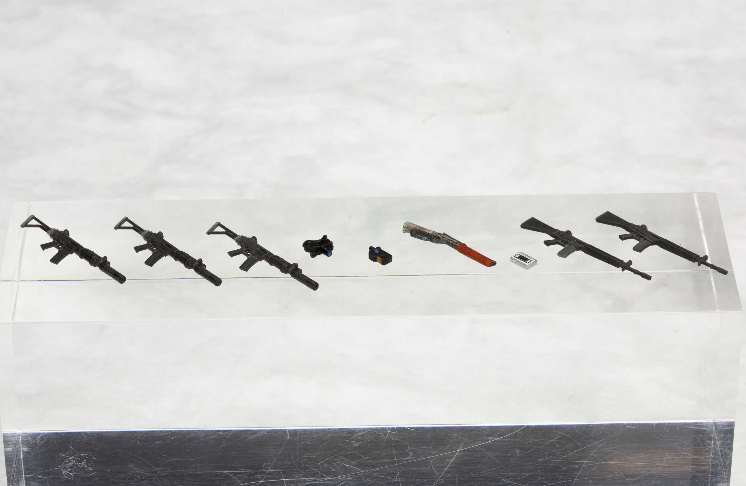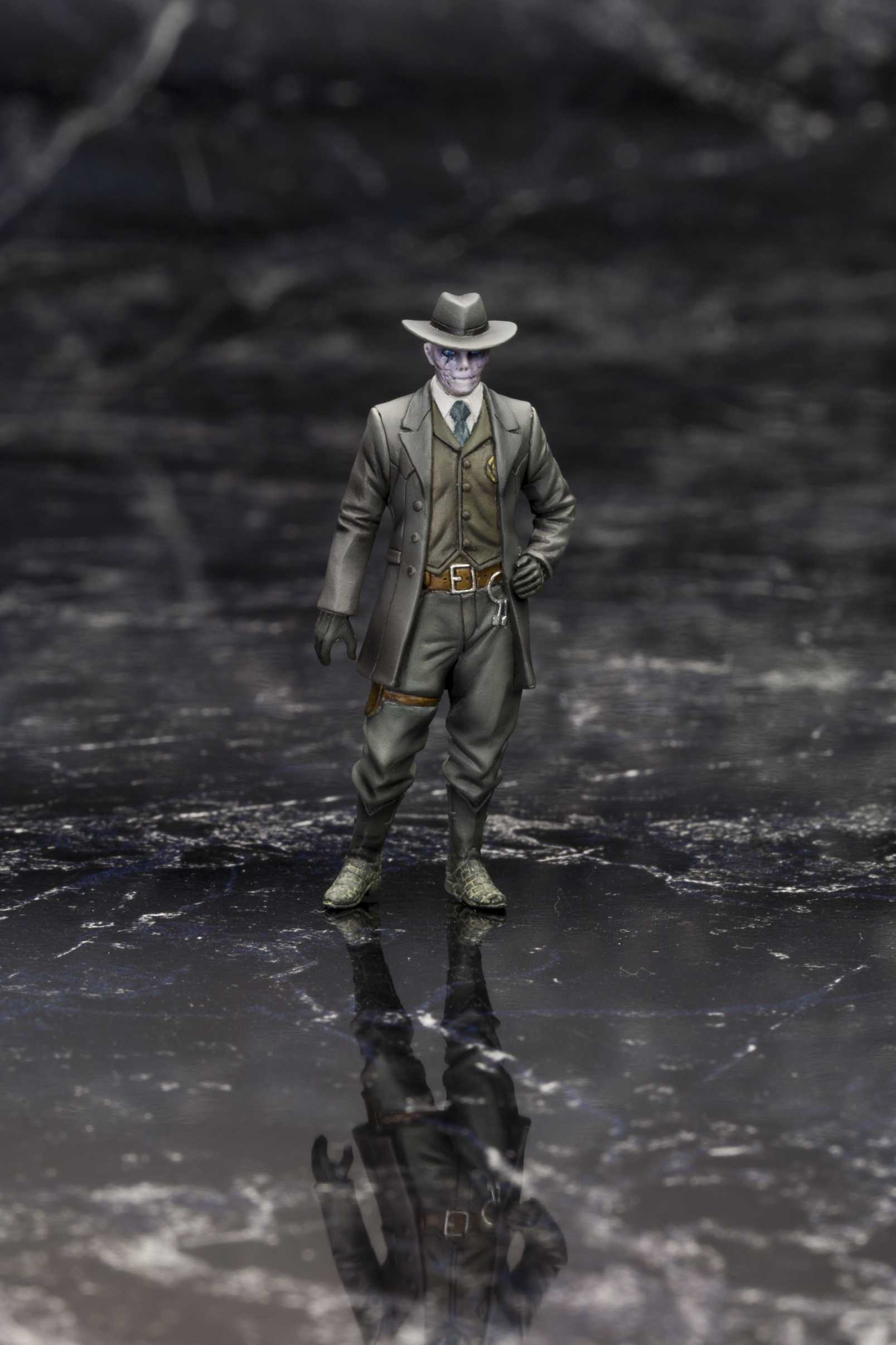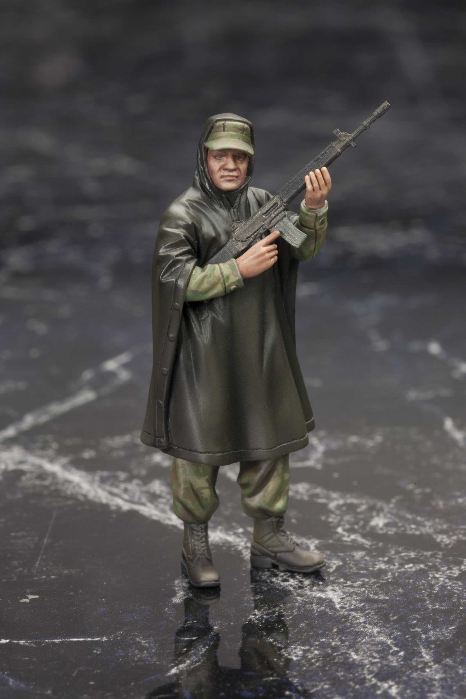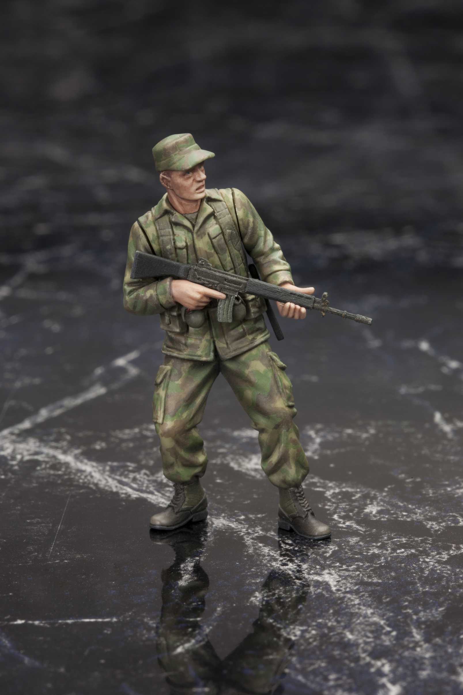 「"V"の幕がついに上がる―。」大人気アクションゲーム『METAL GEAR SOLID V: GROUND ZEROES』より、1/35スケールプラモデル組み立てキットが登場です。立ち姿/走り姿/しゃがみ姿のスネーク、スカルフェイス、チコ、海兵隊員(通常Ver.とポンチョ着用Ver.の2種)、それぞれのフィギュアが封入されています。ゲーム中のキャラクター達が生き生きと再現されたフィギュアは、塗装しやすいプラスチック製の組立式となっております。しゃがみ姿のスネークとナイトビジョンゴーグルを組み合わせると、ゲーム冒頭の印象的な「待たせたな」のシーンも再現可能です。装備品として、「AM MRS-4 RIFLE」 3丁、「AM RIFLE TYPE 69」2丁、「スカルフェイス用銃1丁」、「ナイトビジョンゴーグル」、「iDROID」、「カセットプレイヤー」が付属します。プラモデルとも相性の良いサイズで、さまざまなディスプレイをお楽しみいただけるセットです。